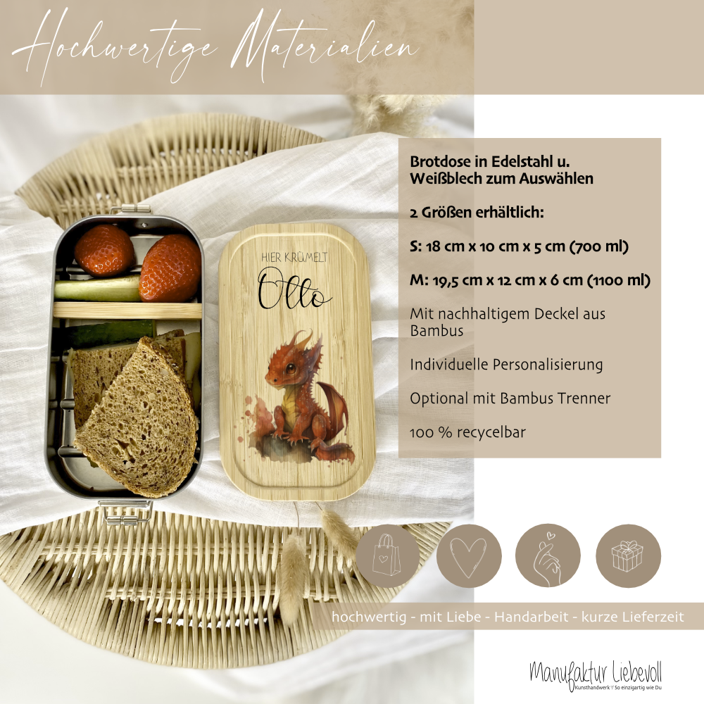 Die Brotdose wird liebevoll in unserer Manufaktur von Hand mit dem Drachen und dem Namen gestaltet. Die Lunchbox eignet sich perfekt als Aufbewahrungsbox von Broten, Obst und Gemüse. Du hast die Möglichkeit, die Brotdose individuell mit Trennwänden zu erweitern und die Lunchbox nach deinen Bedürfnissen zu individualisieren / anzupassen.