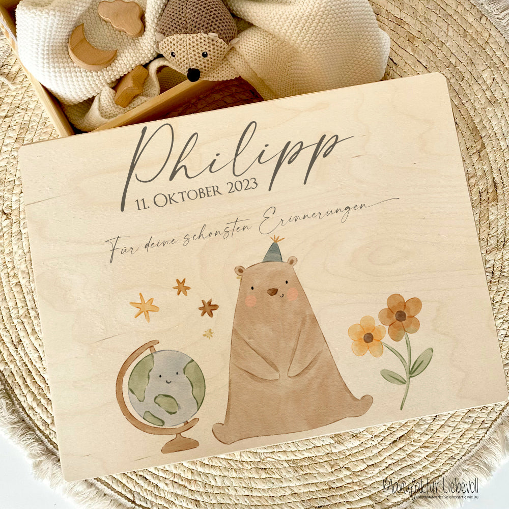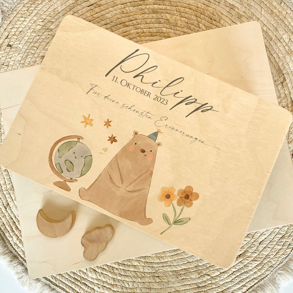 Personalisierte Erinnerungsbox aus Holz mit Motiv: Bär für Babys