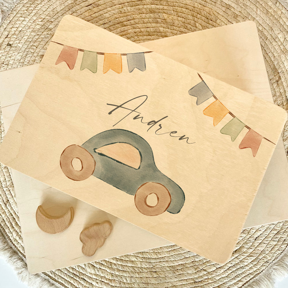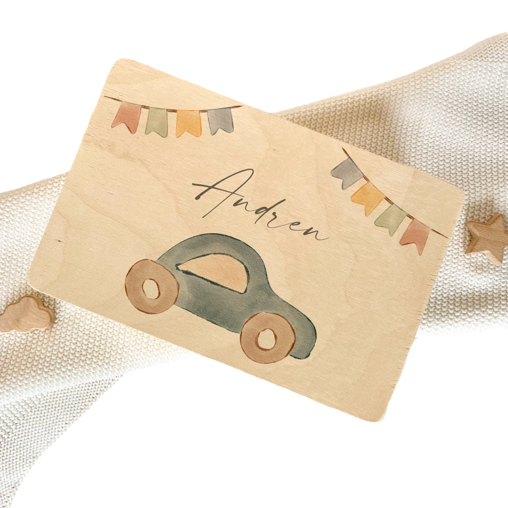 Die Erinnerungsbox wird mit dem Namen des Kindes angefertigt. Mit dem niedlichen Auto Motiv wird die Holzkiste, sowie mit zwei Girlanden gestaltet.