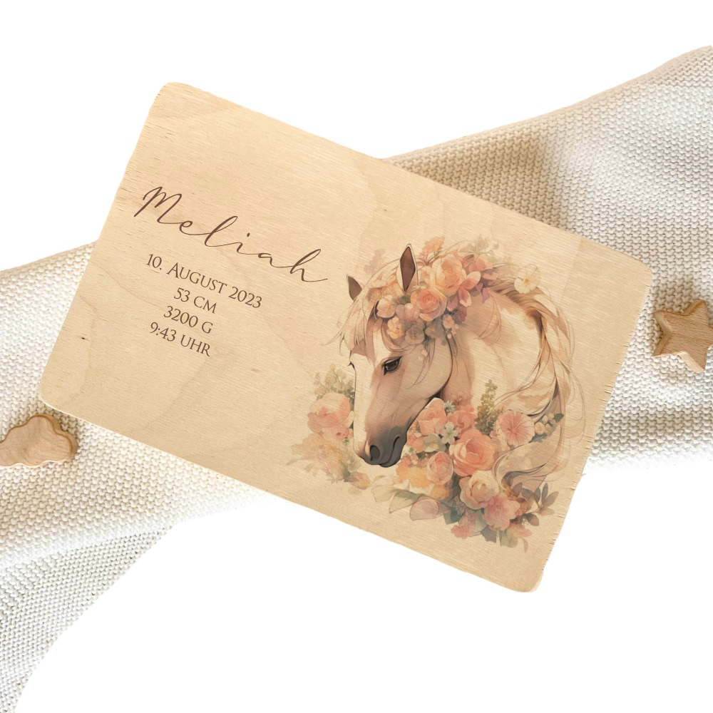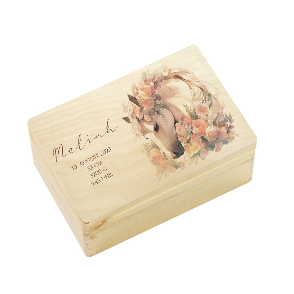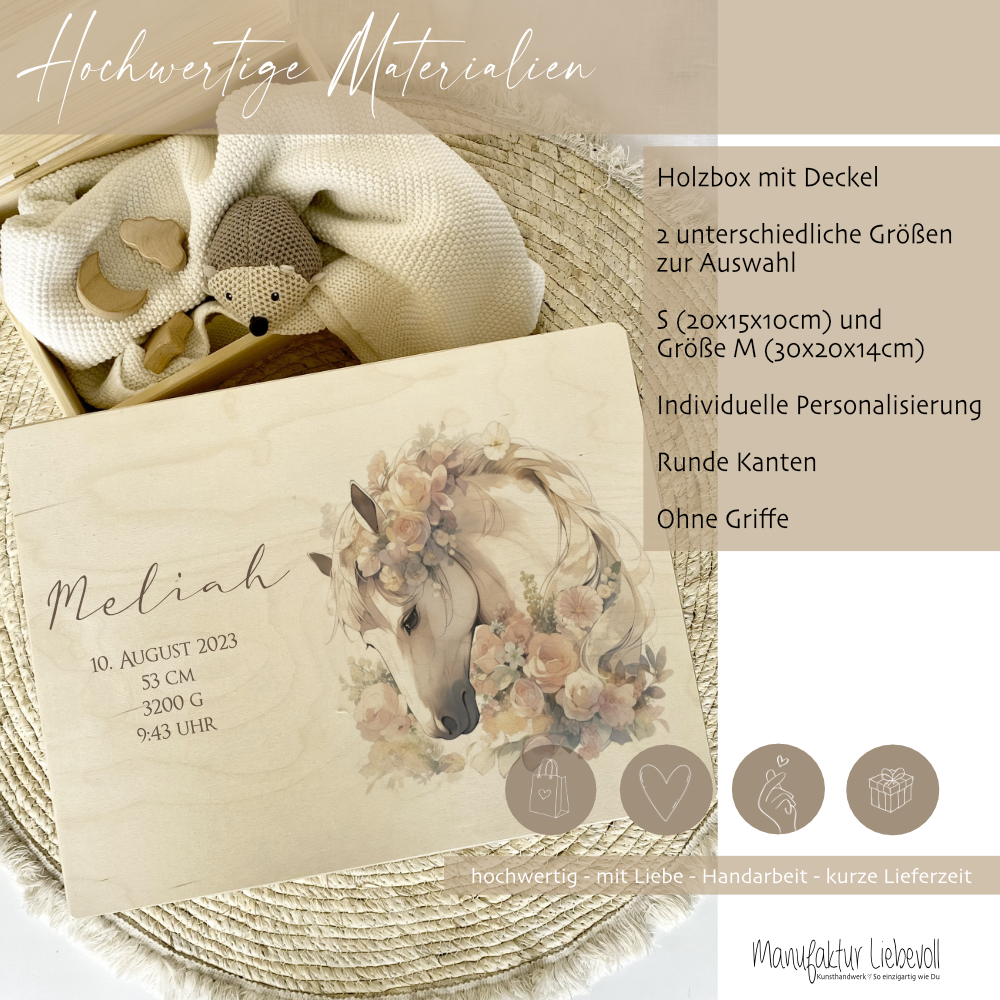Besondere Erinnerungsbox und Holzkiste zur Geburt, Taufe, Geburtstag mit floralem Pony Motiv. Die Erinnerungskiste wird liebevoll in unserer Manufaktur mit dem Namen des Kindes und den Geburtsdaten personalisiert.