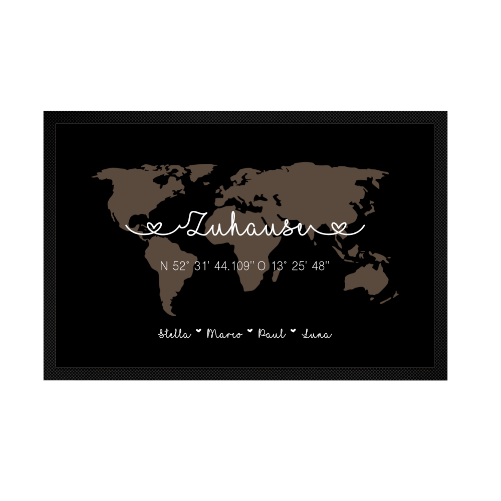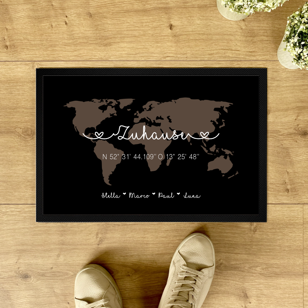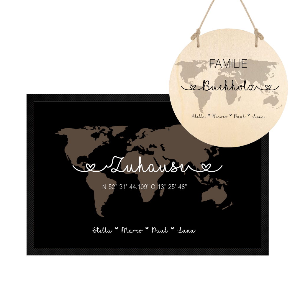 Jede Fußmatte wird mit dem Wort „Familie“ angefertigt. Sollte dies nicht gewünscht sein, schreibe den Hinweis unbedingt mit in das Personalisierungsfeld (Bsp: Ohne das Wort Familie).