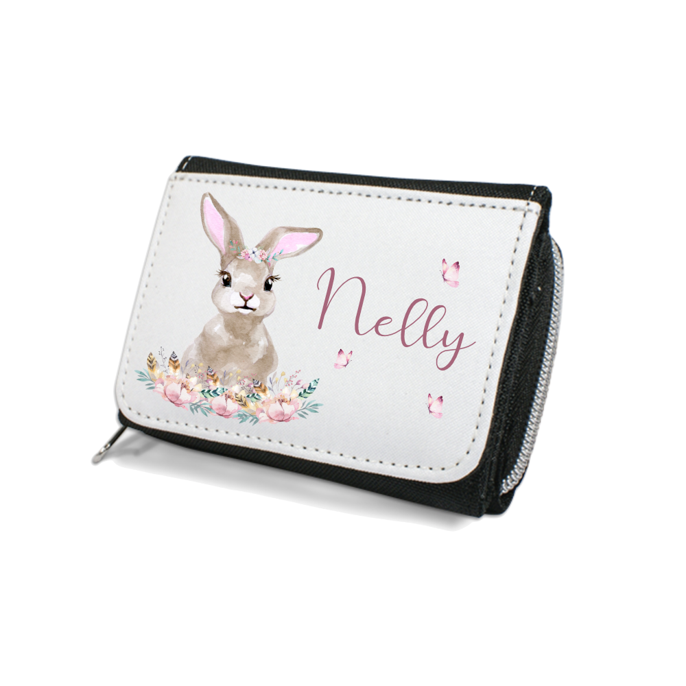 Kinderportemonnaie für Mädchen u. Jungen mit Tiermotiv u. Name | Geldbörse mit Wunschname u. Tierbaby | 4 Motivvarianten zur Auswahl | Fuchs, Bär, Hase, Waschbär