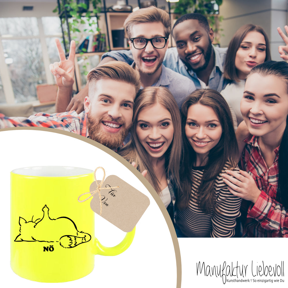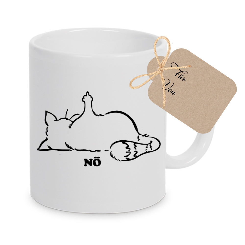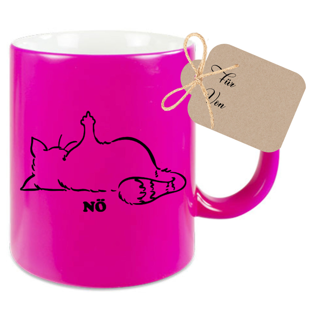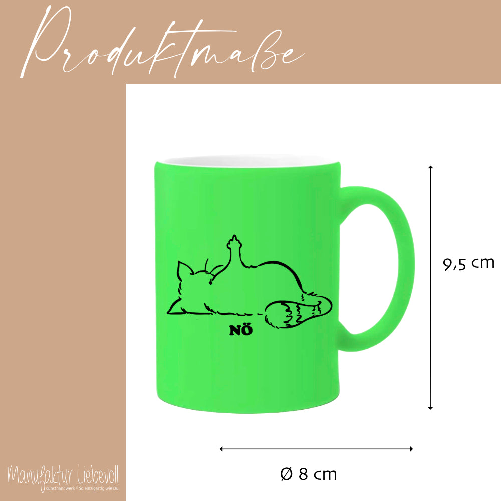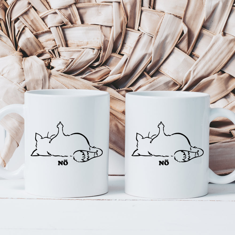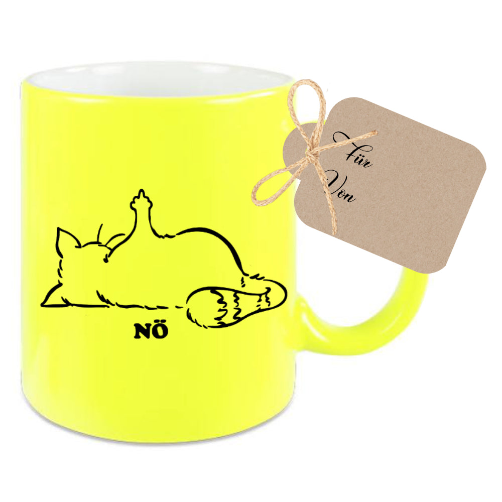 Katzentasse mit Spruch Nö, witzige Tasse für Männer und Frauen. Die Tasse mit Spruch "Nö", wird liebevoll in unserer Manufaktur bedruckt. Du hast die Wahl zwischen den Tassenfarben Gelb, Grün, Pink und Weiß zu wählen. DieTasse wird beidseitig mit dem Motiv gestaltet.