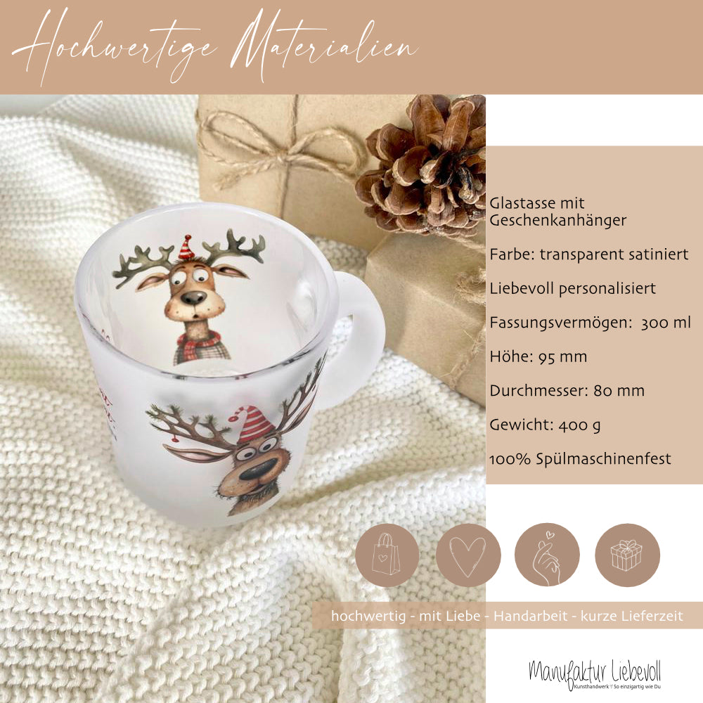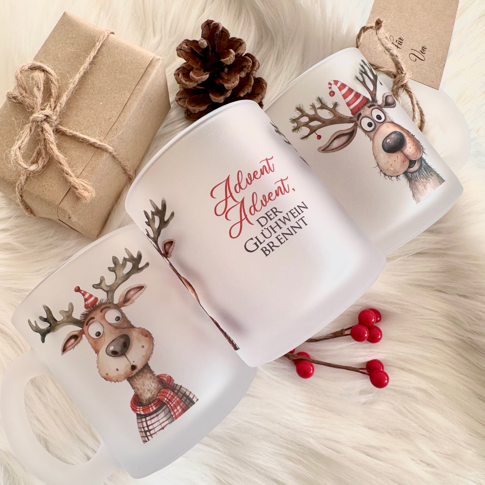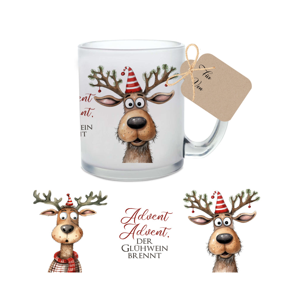 Diese niedliche Glastasse eignet sich perfekt für Punsch und Glühwein. Die lustige Glühweintasse wird mit dem niedlichen Motiv - zwei Rentiere mit Spruch "Advent, Advent, der Glühwein brennt" gestaltet. Das Punschglas ist ein süßes Weihnachtsgeschenk, Nikolausgeschenk, das Geschenk für die bevorstehende Weihnachtsparty und ein witziges Wichtelgeschenk.