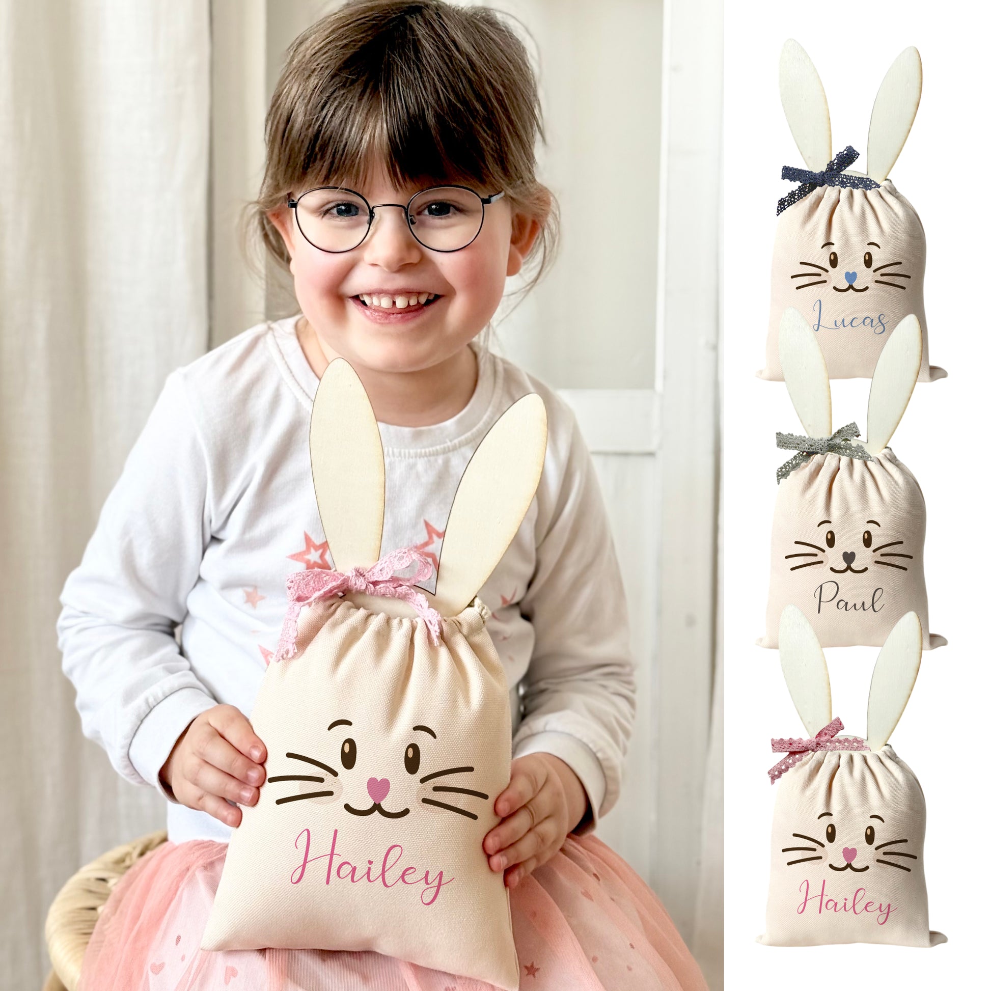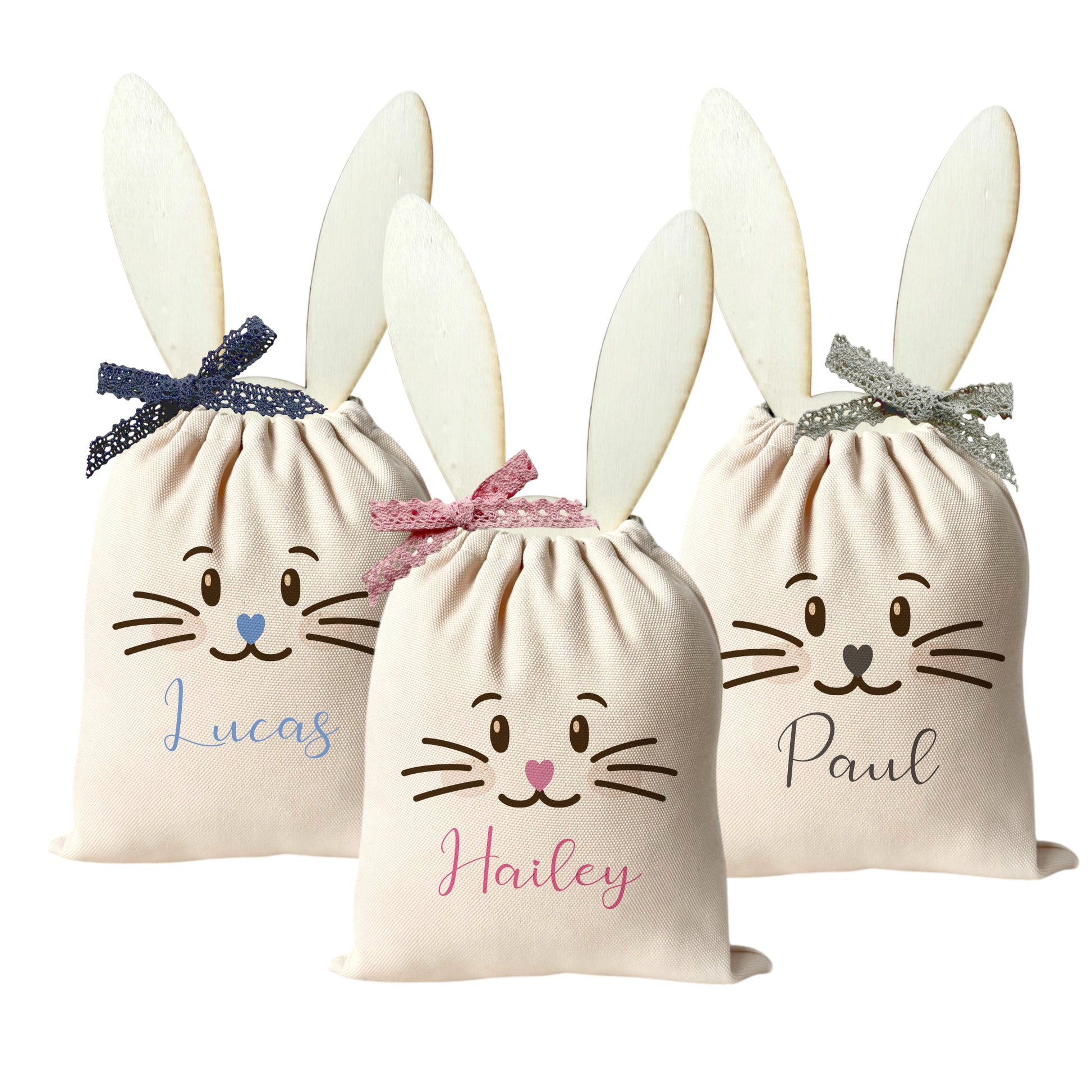 Niedliches Design: Unsere Ostergeschenksäckchen sind in 3 fröhlichen Designs und mit rosa, blauer oder grauer Spitzenschleife und passenden Osterhasengesichtern erhältlich. Sie bringen die perfekte Osterstimmung in dein Zuhause und machen jede Bescherung zu etwas ganz Besonderem.