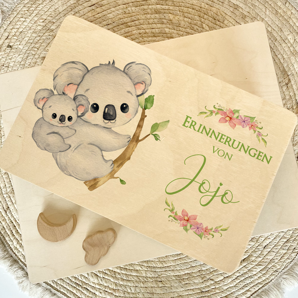 Liebevoll personalisierte Koala Erinnerungskiste aus Holz