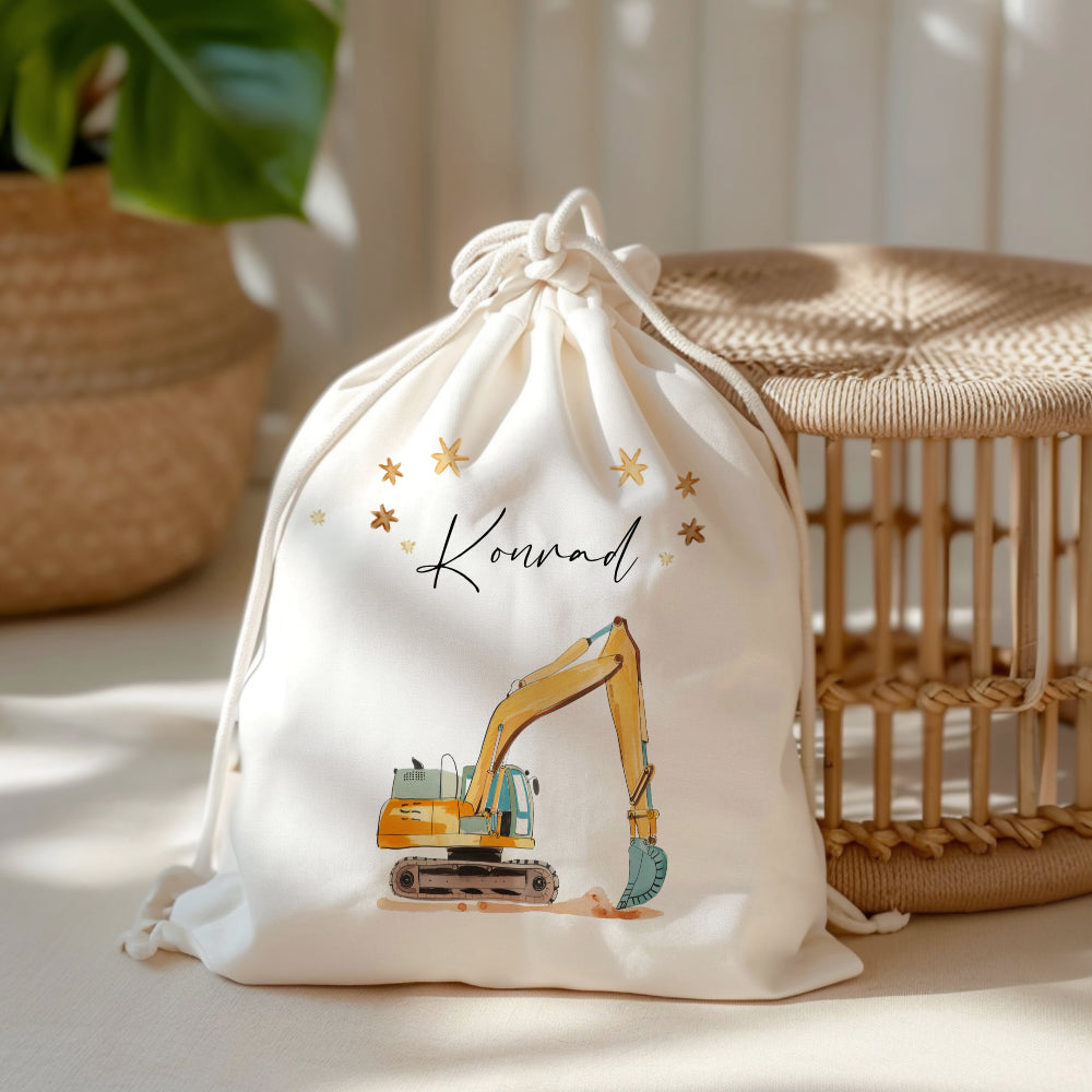 Doch das Beste daran? Du kannst jeden Beutel mit dem Namen deines Kindes personalisieren! So geht nichts mehr verloren, und jeder weiß sofort, wem der Beutel gehört. Wähle aus drei tollen Motiven: Bagger, Feuerwehr oder LKW – perfekt für kleine Jungs und Mädchen, die von großen Fahrzeugen träumen!