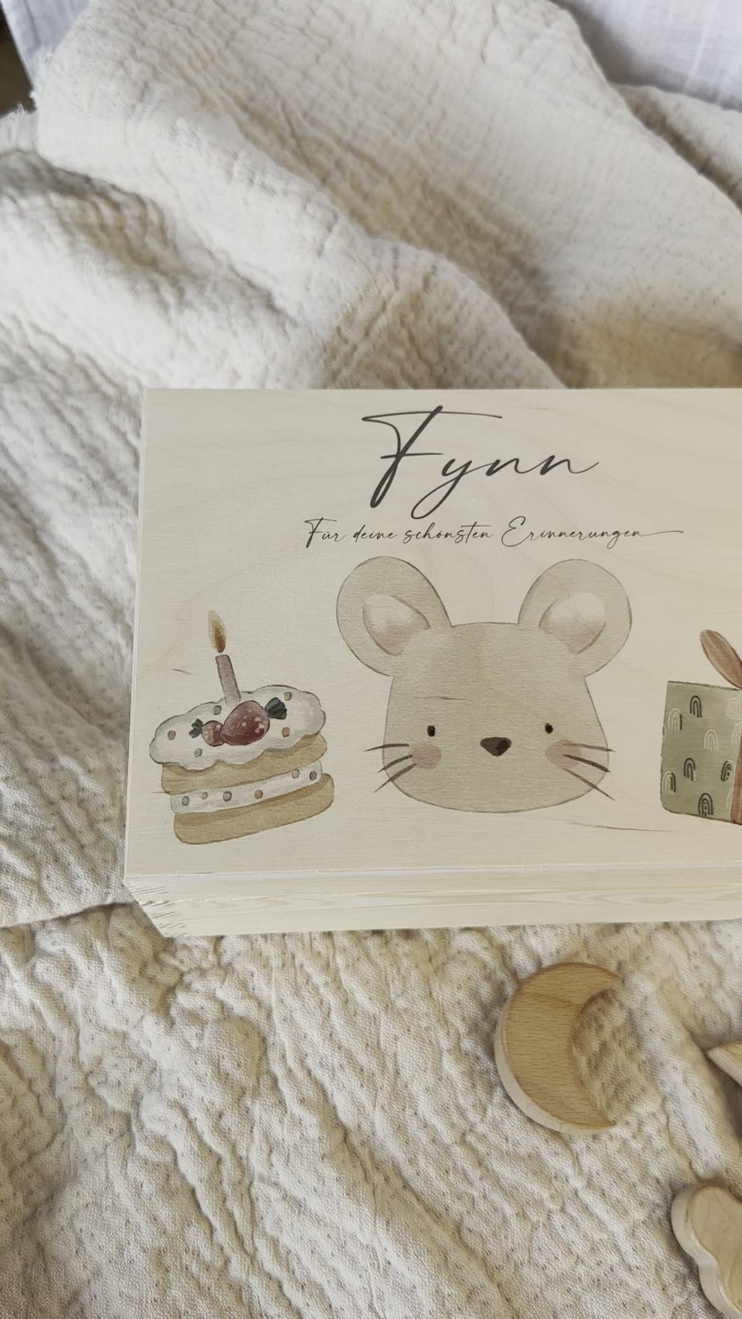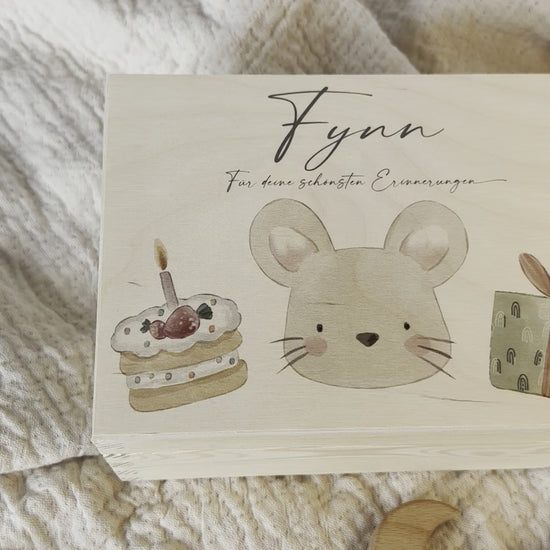 Die personalisierte Erinnerungskiste wird mit dem niedlichen Motiv "Maus", dem Kindernamen und dem Geburtsdatum gestaltet. Die Holzkiste ist mit einem Deckel versehen.