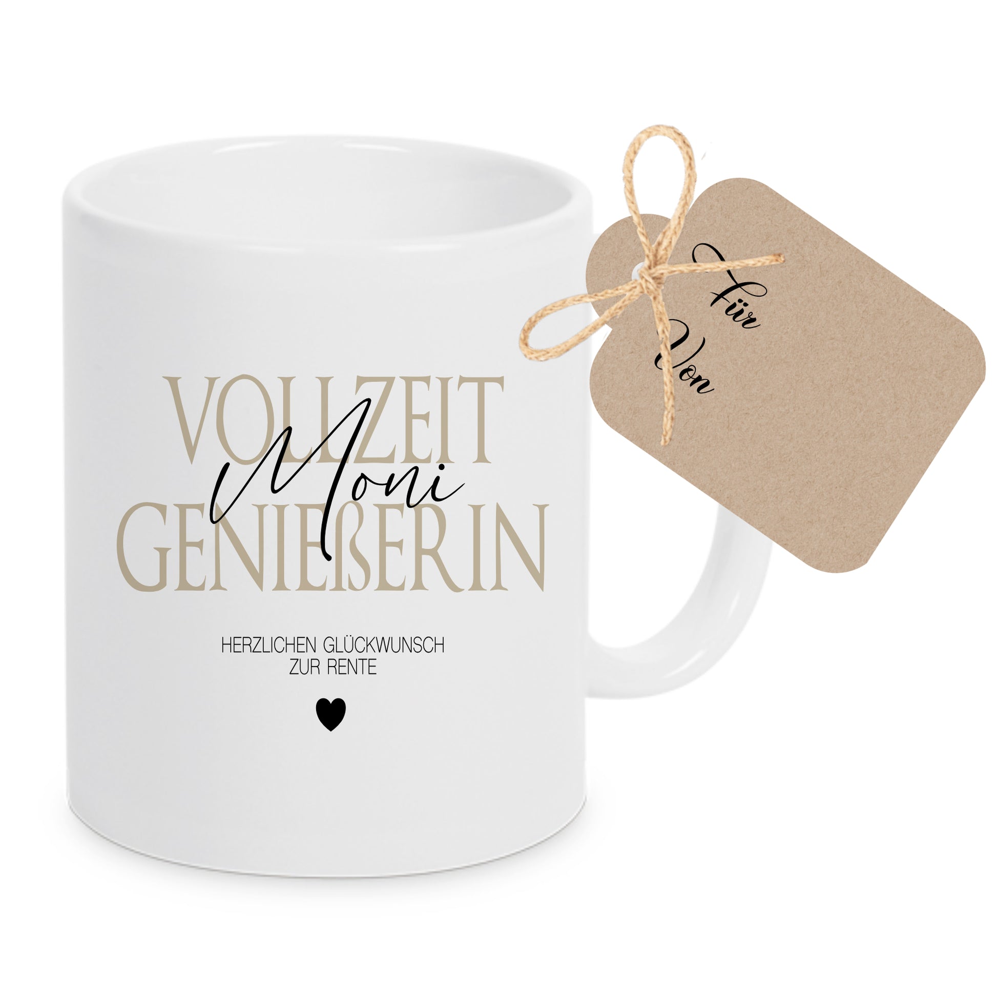 Jede Tasse wird individuell mit dem liebevollen Spruch „Vollzeit Genießerin“ bzw. "Vollzeit Genießer" sowie "Herzlichen Glückwunsch zur Rente" und deinem Wunschnamen auf beiden Seiten bedruckt. So wird dein Geschenk zu einem einzigartigen Erinnerungsstück, das den besonderen Moment des Abschieds gebührend feiert. Überrasche die zukünftige Rentnerin mit einer ansprechenden Tasse, die sie bei jedem Schluck an diesen neuen Lebensabschnitt erinnert – sei es beim morgendlichen Kaffee oder beim entspannten Teetrinken am Nachmittag.