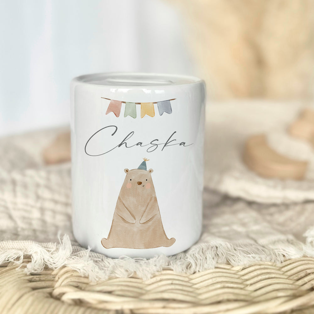 Personalisierte Spardose aus Keramik mit niedlichem Bär für Mädchen und Jungen. Die Spardose ist das Geschenk für Kleinkinder und Kinder. Das Geschenk ist funktional und perfekt für das Taschengeld. Die liebevoll gestaltete Spardose für Kinder, wird mit dem Namen des Kindes gestaltet. Das niedliche Bärenmotiv wird beidseitig gestaltet.