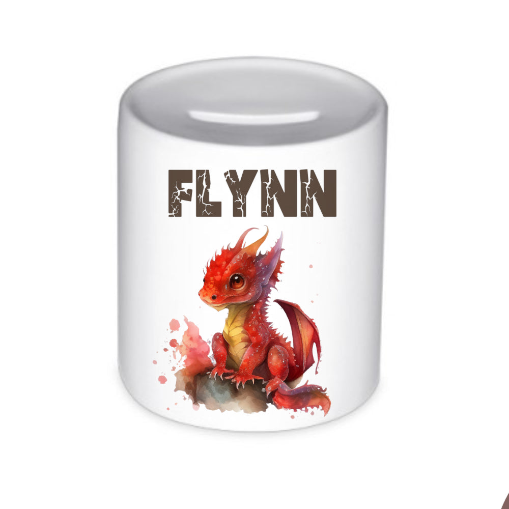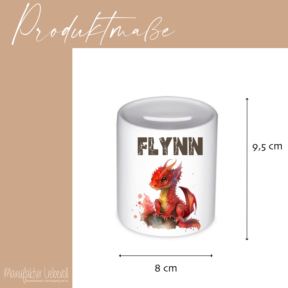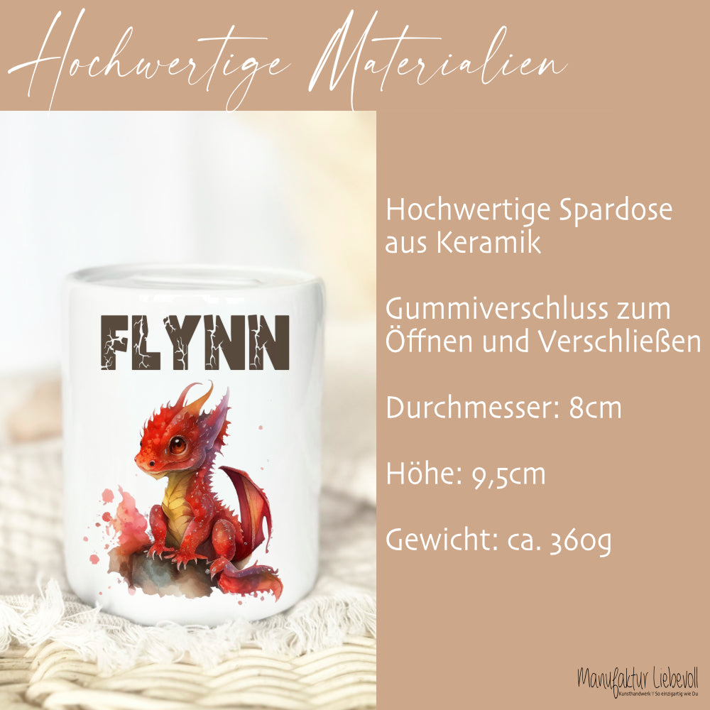Spardose mit Drache für Kinder. Die Spardose personalisiert mit Namen, ist ein schönes Geschenk zur Einschulung und zum Geburtstag. Die Kinderspardose wird mit dem roten Drachen und dem Namen personalisiert. Deine Manufaktur Liebevoll