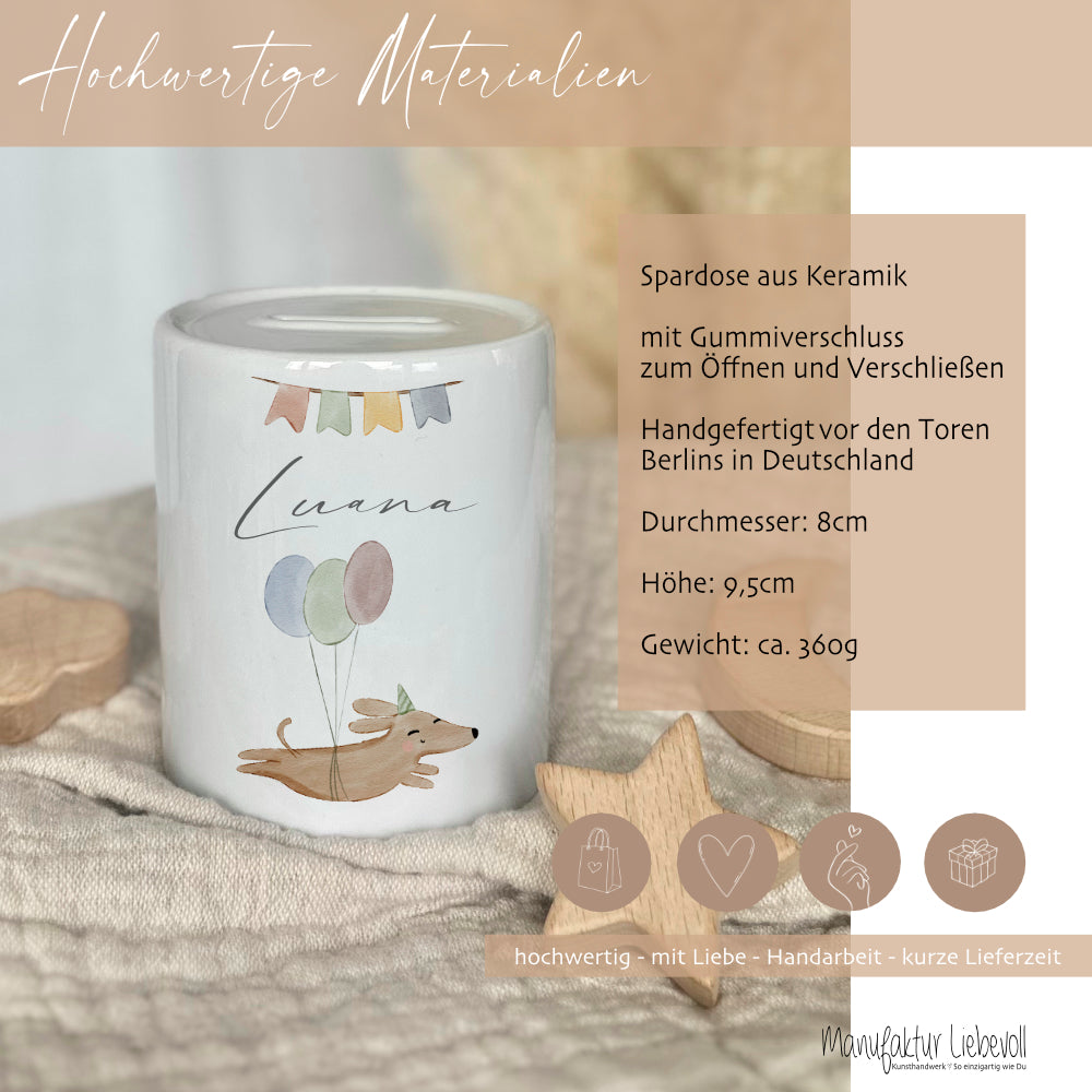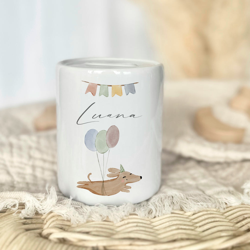 Die Spardose mit dem niedlichen Hund, ist ein schönes Geschenk für Kinder. Die Kinderspardose wird beidseitig mit dem Motiv gestaltet.