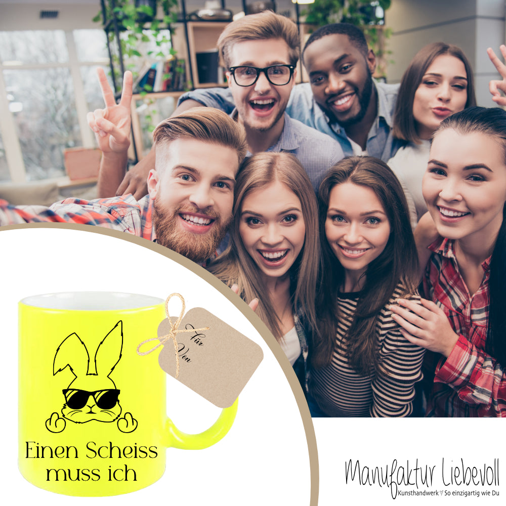 Originelle und witzige Geschenkidee zum Osterfest für Männer und Frauen. Die Tasse mit dem Spruch: "Einen Scheiss muss ich", wird beidseitig auf die Tasse deiner Wahl gestaltet. Der coole Osterhase mit Sonnenbrille, zeigt seine Stinkefinger.
