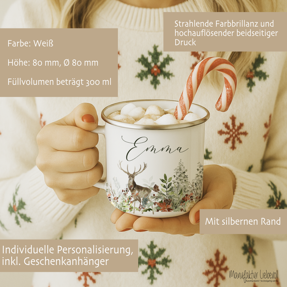 Diese wunderschöne Emaille Tasse mit Metallrand vereint rustikalen Charme mit weihnachtlichem Design. Das detailreiche Motiv aus Hirsch, Tannen und Winterblumen sorgt für festliche Stimmung – und das Beste: Die Tasse wird mit deinem Wunschnamen personalisiert!