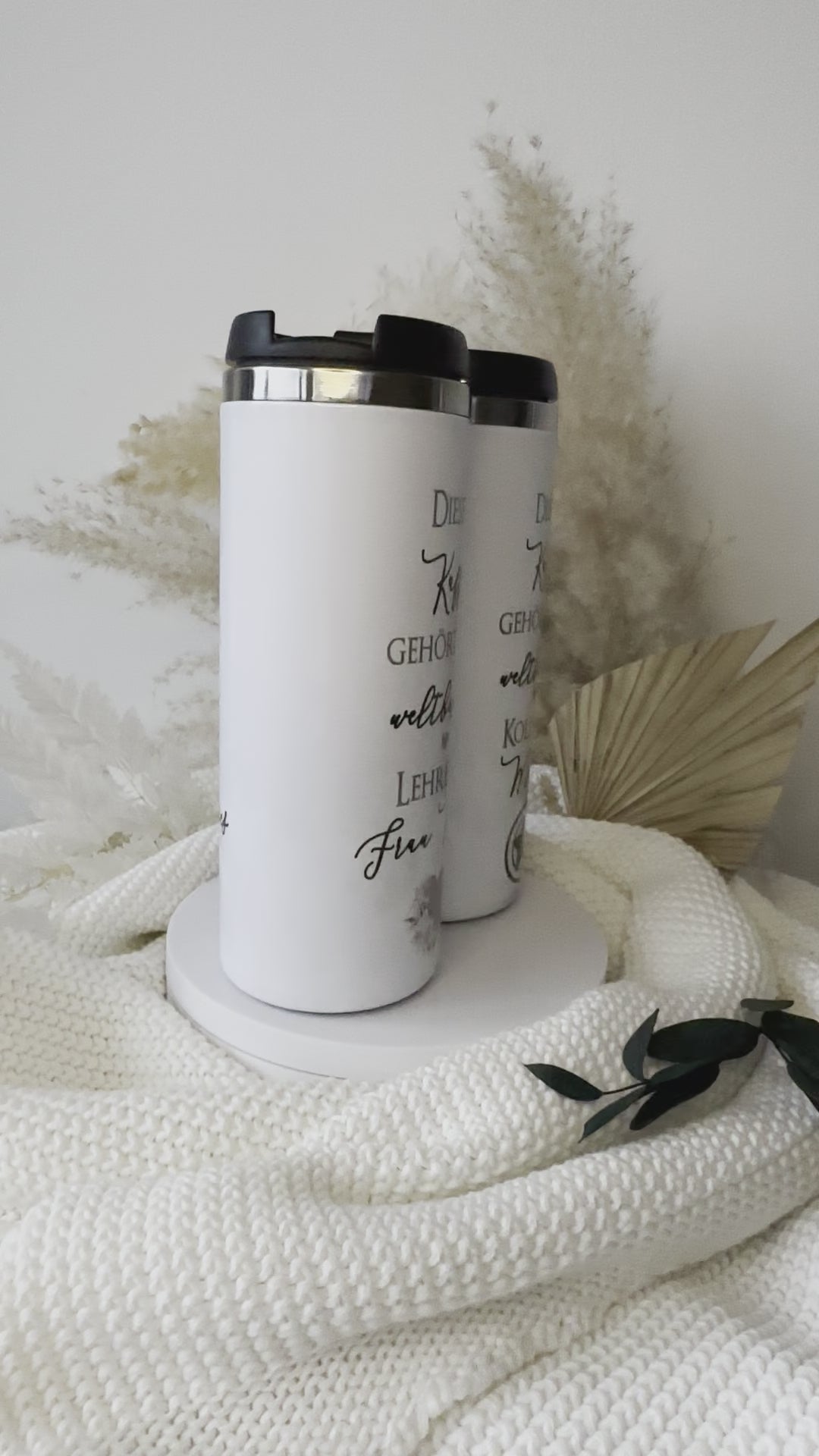 Der Coffee to go Becher wird in liebevoller Handarbeit in unserer Manufaktur Liebevoll nach deinen Angaben hergestellt. Personalisiere in wenigen Schritten den großen Edelstahlbecher und freue dich auf deine einzigartige Geschenkidee mit persönlicher Note. Der Thermobecher aus Edelstahl in weiß, ist mit einem schwarzen Deckel mit Schraubverschluss versehen. Das Wunschmotiv, deine Personalisierung wird stilvoll, wie auf dem Produktbild dargestellt, auf den Becher designt.